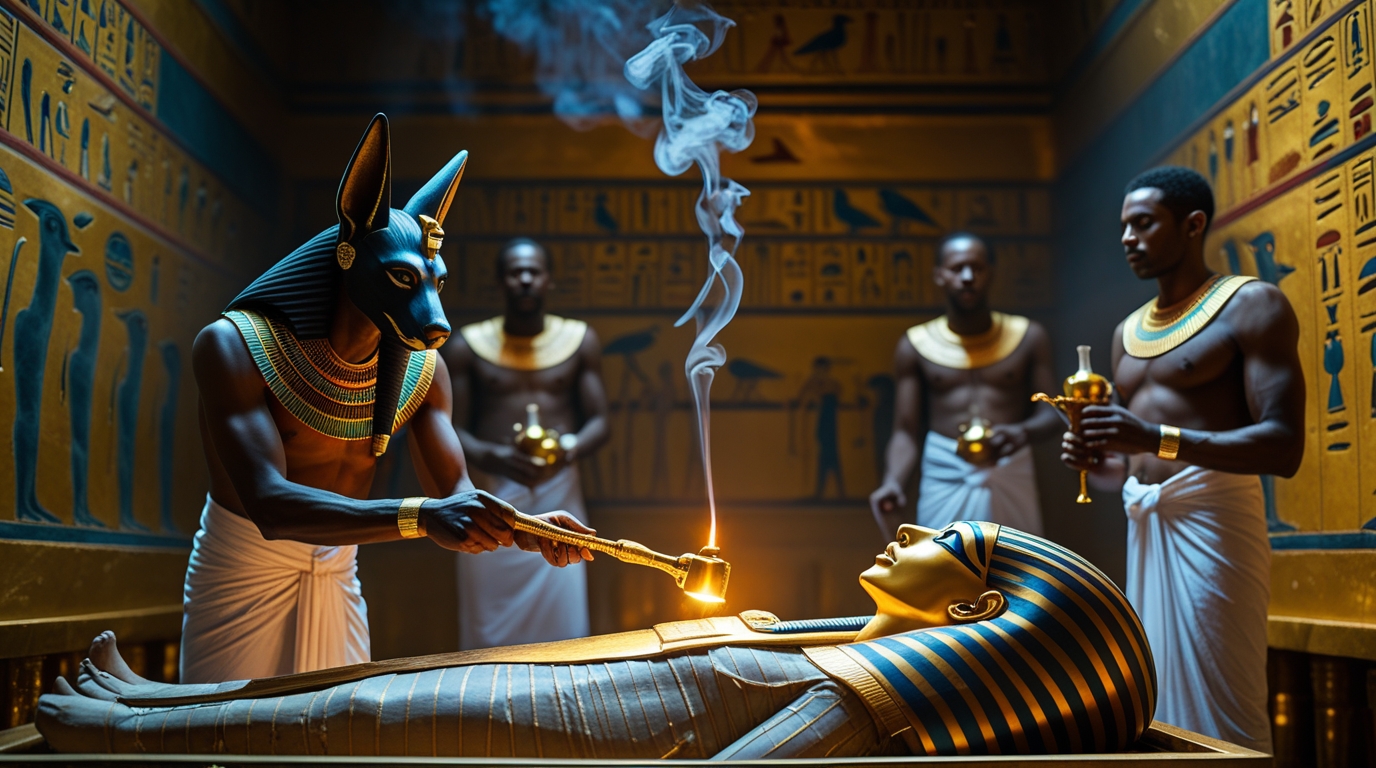 Главным духовным покровителем всего обряда считался Анубис. Старший жрец-бальзамировщик нередко облачался в маску Анубиса — чёрную шакалью голову — и буквально воплощал бога на земле, действуя от его имени.