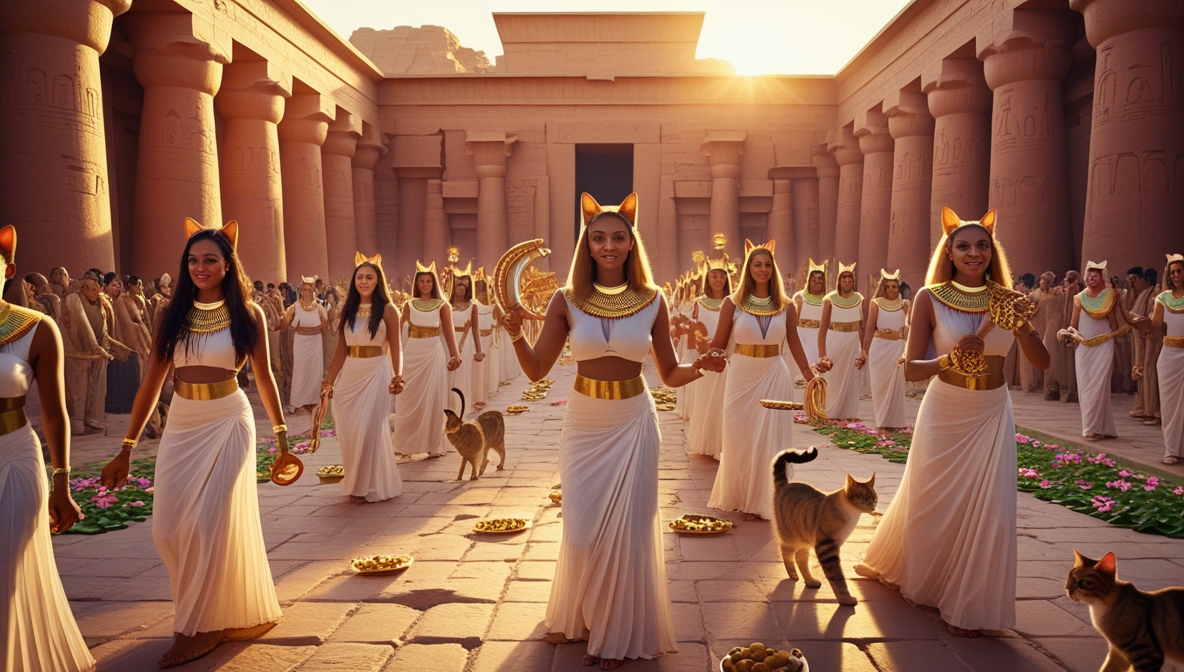 Представьте себе реку Нил, по которой плывут тысячи лодок, украшенных цветами и разноцветными лентами. На каждой лодке поют женщины, мужчины играют на систрах и флейтах, а воздух наполнен ароматом мирры и лотоса. На берегах собрались более 700 000 человек — паломники, жрецы, торговцы и простые крестьяне. Все они пришли чтобы отпраздновать день великой богини-кошки Бастет — самый массовый, самый шумный и самый радостный праздник всего Древнего Египта.