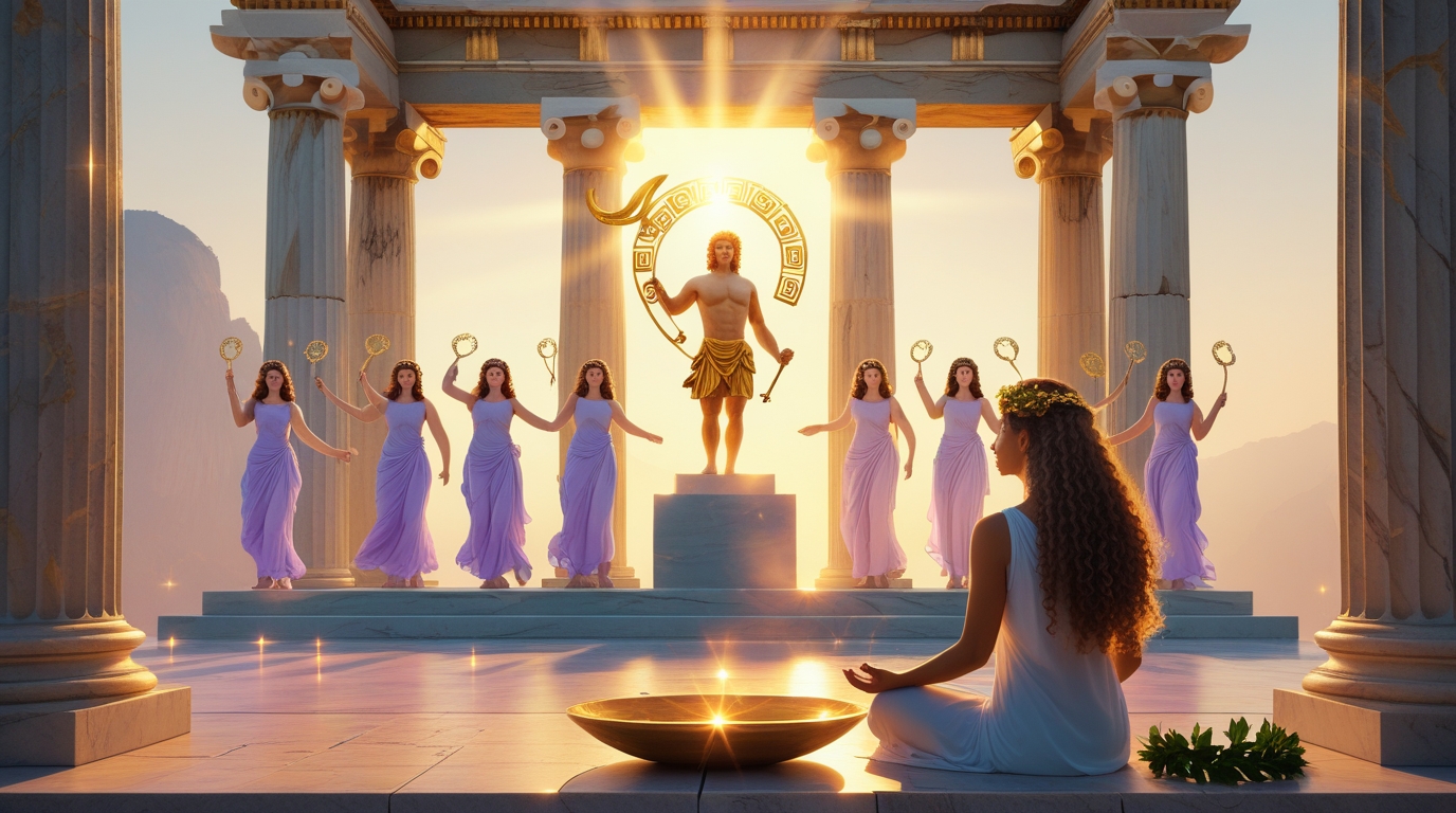 Сядьте удобно, закройте глаза. Представьте, что стоите на вершине горы Парнас на рассвете. Лучи восходящего солнца начинают окрашивать небо в золото. Перед вами появляется фигура вечно юного бога — сияющего, в белых одеждах, с золотой лирой. Он улыбается вам. Позвольте его свету наполнить ваше тело — от макушки до кончиков пальцев. Ощутите тепло, ясность, вдохновение. Задайте свой вопрос и внимательно слушайте — ответ может прийти в виде образа, слова, ощущения. Оставайтесь столько, сколько нужно. Поблагодарите Аполлона и медленно выходите из медитации.