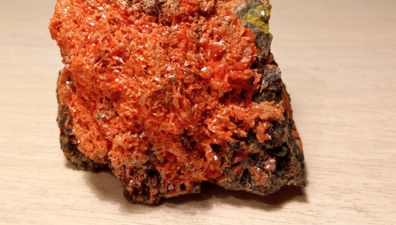 Цвет крокоита — это первое, что поражает при взгляде на него. Базовая палитра охватывает жёлто-оранжевые, насыщенно-оранжевые, красно-оранжевые и глубоко-красные оттенки, вплоть до бордового с коричневатостью. Неповторимый алмазный блеск кристаллов создаёт эффект внутреннего свечения. При рассеянном свете камень мерцает, как живой огонь. Однако стоит помнить, что под воздействием прямых солнечных лучей или ультрафиолета крокоит постепенно тускнеет и теряет яркость — это важная особенность хранения минерала.